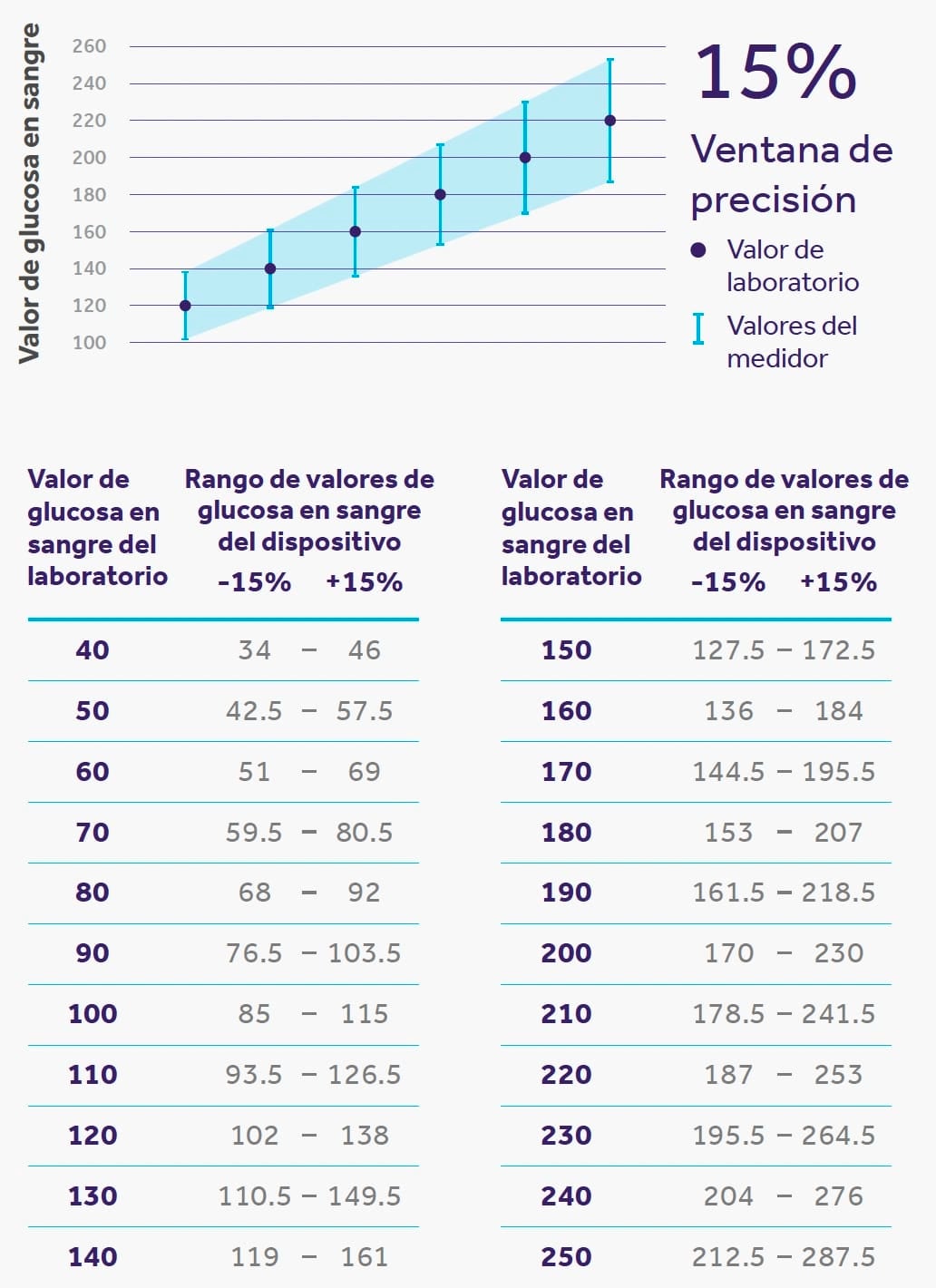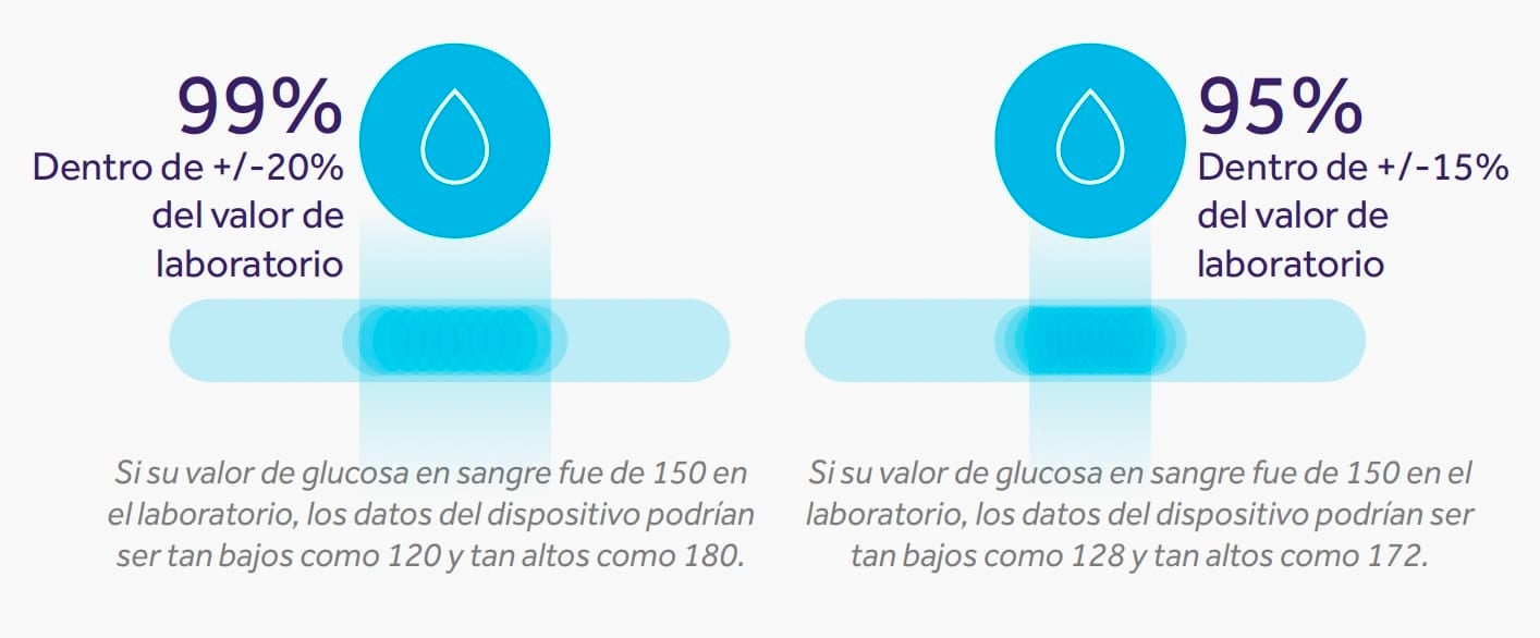 Los resultados de su medidor están dentro de un rango de niveles de glucosa en sangre reales medidos en el laboratorio, no de los resultados de otro medidor. Por ejemplo, si sus verdaderos niveles de glucosa en sangre son de 100 mg/dL, los resultados del medidor pueden oscilar entre 85 y 115 mg/dL. La comparación de dos valores dentro de este rango no indica cuál es el más preciso.