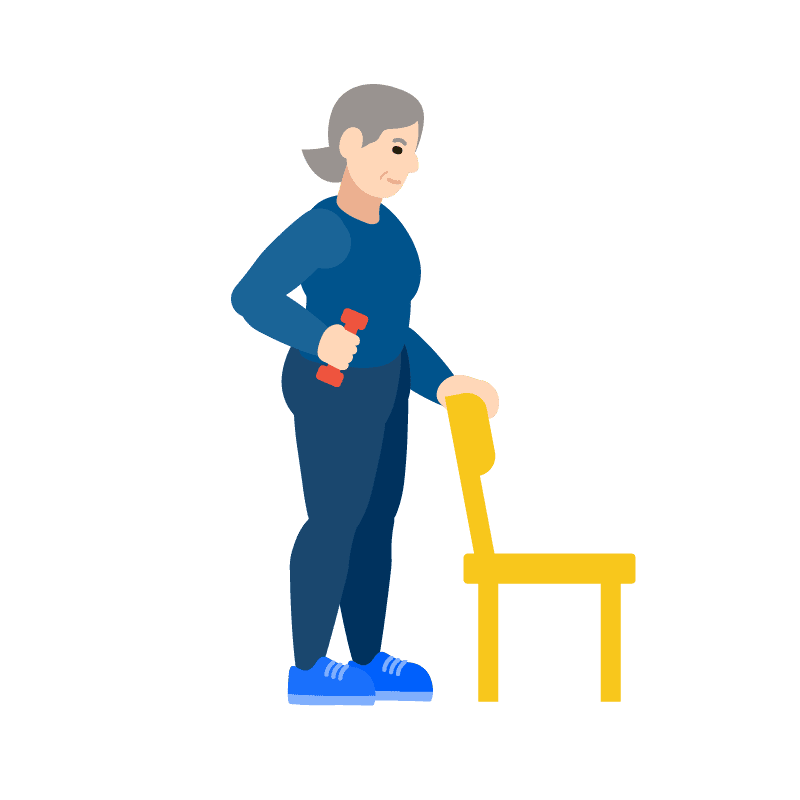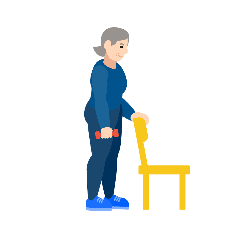 Párese detrás de la silla, con la espalda recta, use una mano para apoyarse y realice el remo con la otra mano. Luego cambie de lado.