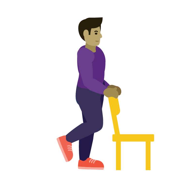Apóyese en la silla para mayor sujeción y párese en una pierna durante 15 a 30 segundos. Si siente comodidad, libere la mano de apoyo e intente mantener el equilibrio durante 15 a 30 segundos. Repita con la otra pierna.