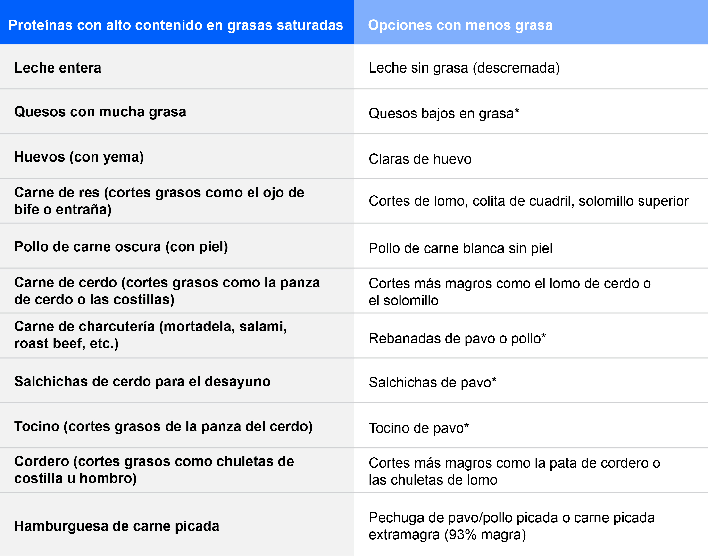 Algunas fuentes de proteína pueden ser altas en grasas saturadas. Ahora bien, un poco de grasas saturadas está bien para el cuerpo. Pero en exceso puede causar problemas de salud como colesterol LDL alto ("malo") y un mayor riesgo de enfermedades cardíacas. Es por eso que es útil cambiar sus fuentes de proteínas de vez en cuando.